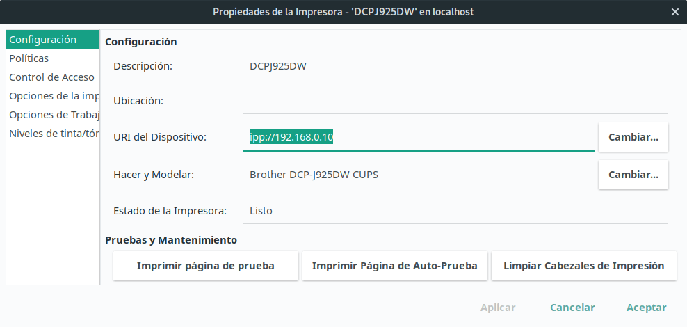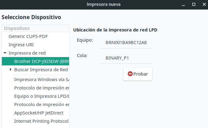 Una vez instalada, y haciendo doble clic en ella, verás que probablemente el URI de tu dispositivo será incorrecto ya que hará referencia a una dirección LPD inexistente o aparecerá como una impresora USB.