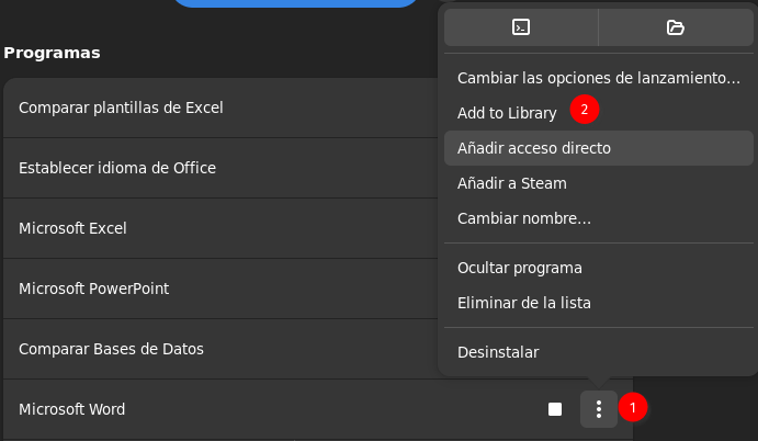 Los programas de una botella pueden renombrarse y añadirse a la Biblioteca de Bottles para una mayor organización. Para ello, simplemente hay que ir a la botella y seleccionar los tres puntos verticales en el programa que queremos editar y añadir a la biblioteca.